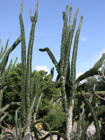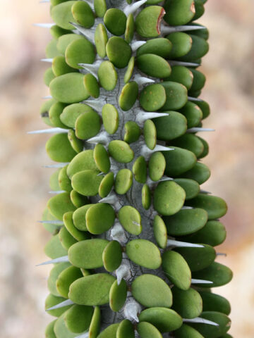 Before leaving, Alluaudia are inspected, watered, and pruned. Larger plants, generally those that ship in 8″ pots, will be topped to 36″ or 48″ overall, depending on the variety, if necessary, to facilitate shipping. Your new plants’ pot is then bagged to ensure that the soil stays in the pot and not loose in the box. Plants are tissue or kraft paper wrapped and generally secured in place with natural biodegradable peanuts.