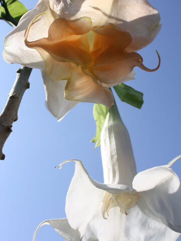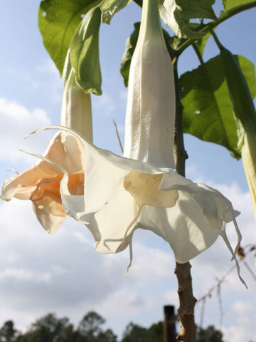 A lovely star-like second white bloom appears to develop within the main flower turning pink with age. Wondrous large soft green leaves and extraordinary pendent trumpet like flowers will be the highlight of any collection when it blooms. This Brugmansia will grow to 10 – 15 feet when given proper care.