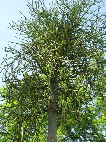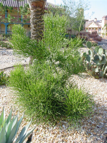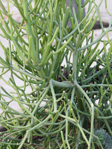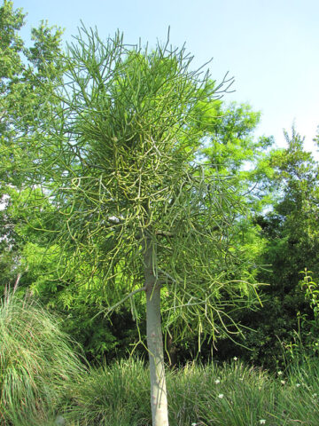 Hard to kill! Tirucallii is a virtually leafless succulent tree with narrow rounded numerous branches, maturing to 30 feet or more. Highly drought tolerant, it has becomes a very popular addition in southwestern landscaping. In a small container its growth remains in check and rarely exceeds 3 to 4 feet. Cuttings of Tirucallii can easily be rooted and shared. These unique plants are easy and fun to grow, simply water when dry.