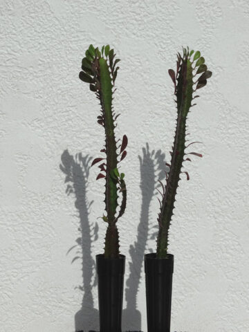 Trigona Red Cathedral one of the most colorful cultivars of Trigona with a mottled pattern in shades of green, red, purple and maroon Thorns sprout in pairs on the stem’s margins with teardrop shaped red toned leaves. Given time you can expect your new plant to reach eight to ten feet in height. A single 7 foot plant can weigh well over one hundred pounds. Perfect for container growing on a balcony or patio. These unique plants are easy and fun to grow simply water when dry.