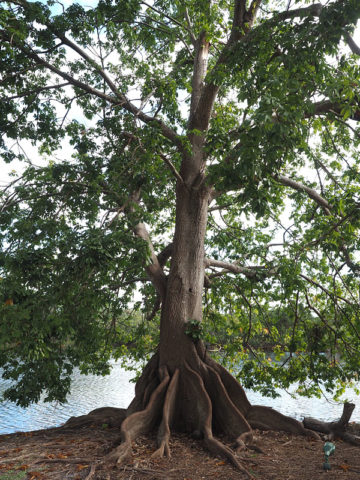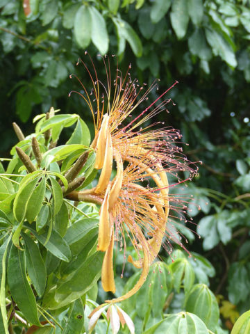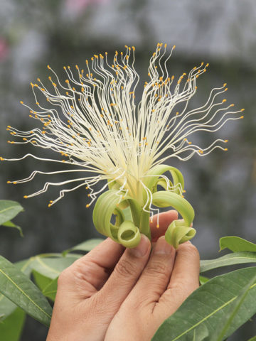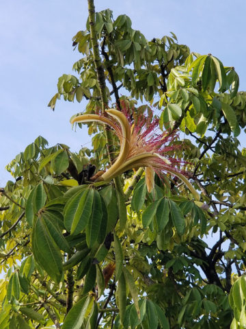 Fragrant large white flowers that bloom at night are followed by 6 inch green pods filled with edible seeds about the size of a baseball. When ripe the pods split and the seeds fall out. They are said to be similar to the flavor of a peanut and can be eaten raw, roasted or fried. Very easy to grow and maintain.