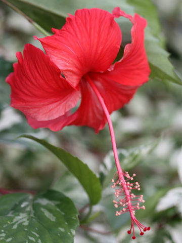 Rarely Offered, Variegated foliage makes Snow Queen pure royalty for the garden or patio. Pendant-like bright red tropical flowers have serrated petal edges and an unusually long flower tube. In cooler climates, Hibiscus make one of the easiest to grow container plants for the urban home garden.