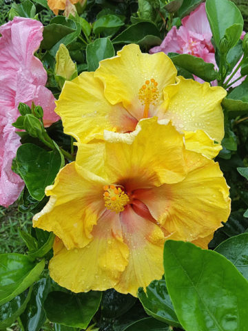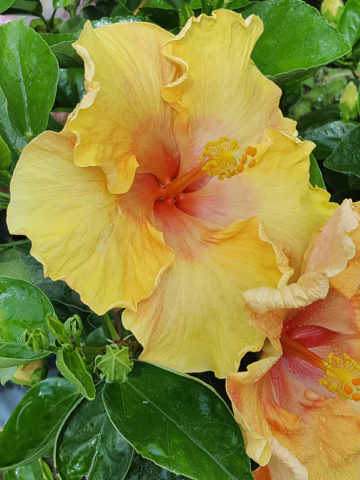 Dinner plate size blooms. Bright and airy gold-lemon flowers can measure up to 9 inches across with spectacular pale orange rays emerging from the center. Petals unfurl and lay back in a away from the erect orange pistil. In cooler climates, Hibiscus make one of the easiest to grow container plants.