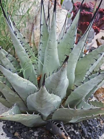 Striking, almost glowing blue gray leaves are arranged in a symmetrical rosette forming a small one and a half foot tall plant. Sword-like leaves have light leaf print and maroon spines along the margins and a wicked sharp leaf tip. This great plant sends out abundant off-sets making it easy to share with friends. Drought tolerant and cold hardy and perfect for the low maintenance gardener.