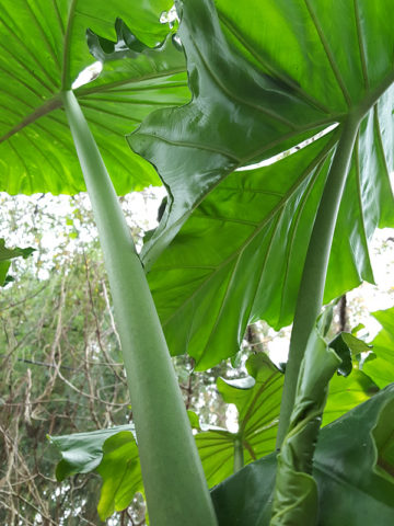 One of the best giant ears for indoor and patio design. This Alocasia makes a stunning upright clump reaching heights of 5-6 ft. The giant green leaves are held upright by strong purple stalks. This is truly an architectural specimen plant for any garden.