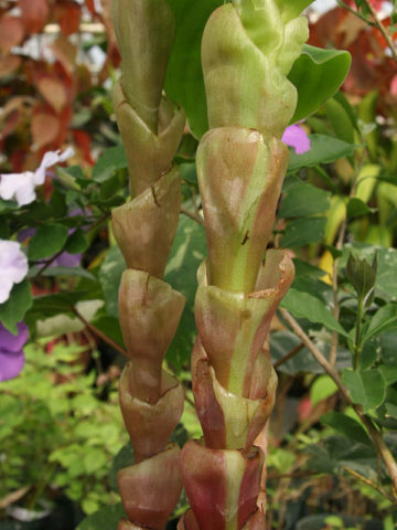 Emerald green water retaining cups form a bellied appearance around the stem. Very unique in appearance Emerald Chalice is thought to attract tree frogs. In ground or in a container Costus grow vigorously when provided with moist well drained soil. These gingers are heavy feeders and grow at their optimum potential when fertilized regularly. Very tropical and easy to grow.