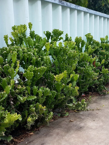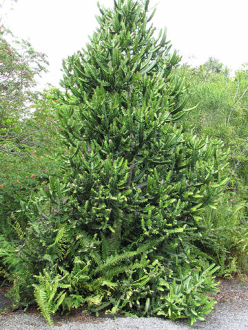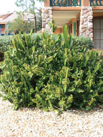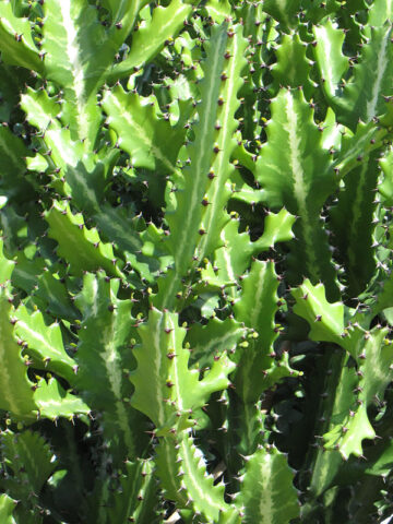 (XL Specimen, 6” Pot) A very tall growing, mainly single trunked elegant Euphorbia. It will periodically and randomly branch. Long soft-ish thorns sprout in pairs on the stem’s margins with the occasional teardrop shaped green leaf. Ideally suited to keep the neighbors at bay. A single six foot shrub can weigh well over one hundred pounds. Perfect for container growing on a balcony or patio.