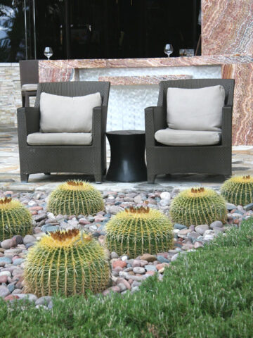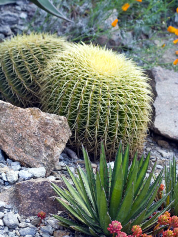 Golden Barrel is considered to be one of the most iconic cacti of the old west. Capable of growing to 3 foot by 3 foot proportions and adorned with curved, incredibly hard, bright golden colored spines that cover and protect the brilliant green, flesh below. As this cactus ages, older barrels will begin to produce offsets, creating a mound of glowing golden balls around its base. This is an architecturally stunning cactus.