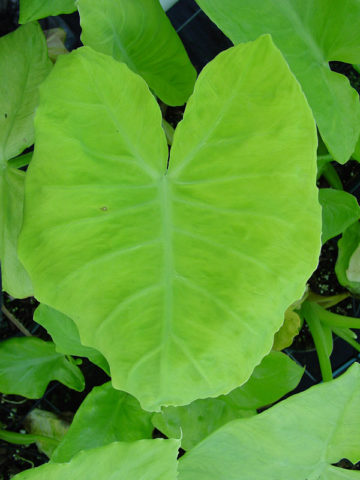 Yellow neon in color, Key West Lime is distinguished in part by its usually lemon-lime, arrowhead shaped leaves with fleshy stems up to 2 feet long. These leaves rise from a broad corm, offshoots appear on short rhizomes extending from the base. Easy to grow and divide this elephant ear will be the centerpiece of your collection.