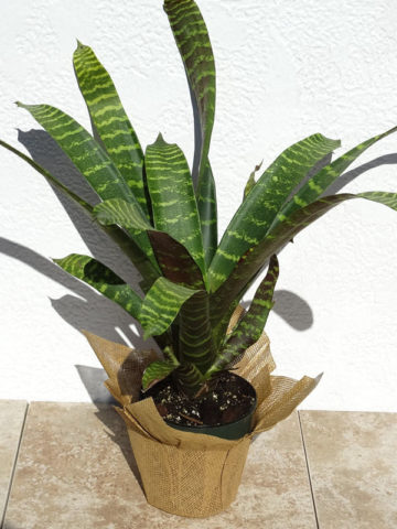 Before leaving, Bromeliad are inspected, watered, and pruned. Larger plants, generally those that ship in 8″ pots, will be topped to 36″ or 48″ overall, depending on the variety, if necessary, to facilitate shipping. Your new plants’ pot is then bagged to ensure that the soil stays in the pot and not loose in the box. Plants are tissue or kraft paper wrapped and generally secured in place with natural biodegradable peanuts.