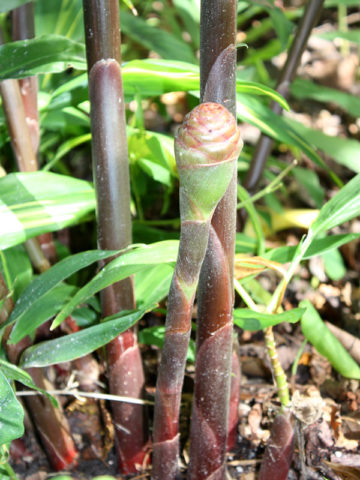 This form of shampoo ginger is a beautiful foliage plant with leaves reaching skyward to heights of 7 feet. Pinecone shaped bracts filled with a pine scented aromatic fluid was used as a shampoo in Hawaii years ago. Bright Green bracts with white flowers emerge in the late summer and flourish into the fall on shafts of 1-2 ft. tall slowing turning into a pale scarlet red coloring.