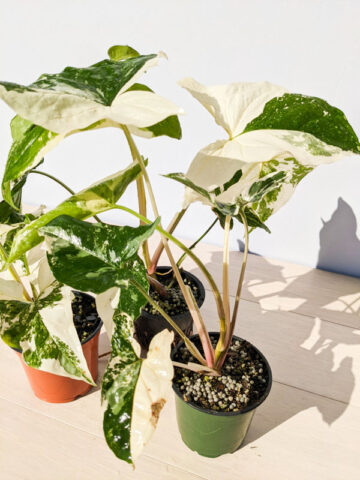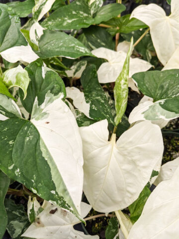 Before leaving, White Knight Albo Variegata Syngonium plants are inspected, watered, and pruned. Larger plants, generally those that ship in 8″ pots or with totems, will be topped to 36″ or 48″ overall, depending on the variety, if necessary to facilitate shipping. Your new plants’ pot is then bagged to ensure that the soil stays in the pot and not loose in the box. Plants are tissue or kraft paper wrapped and secured in place with natural biodegradable peanuts.