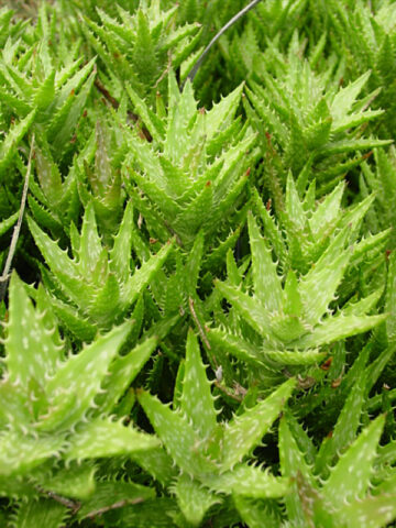 Short bright green triangular shaped overlapping leaves slowing creeping upward. Cream splotched leaves are margined with cat claw like spines. Small in stature Zanzibarica is a great plant for window sills and office cubicles as well as smaller urban gardens and terrariums.