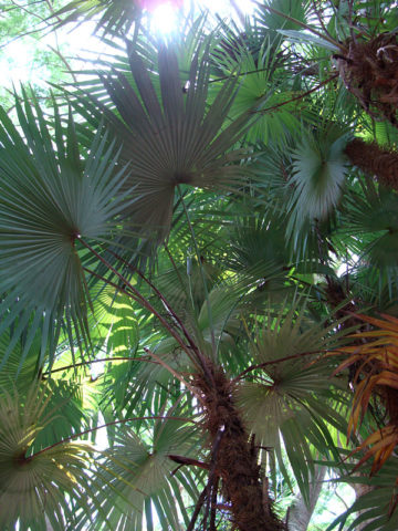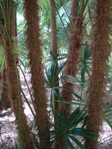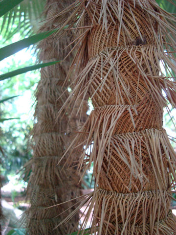 Zombia is a strikingly attractive palm with a trunk that looks to be wrapped in burlap and needles. This exotic unusual palm grows dense multi-trunked clumps that can reach 10 feet tall with trunks that are 2 to 3 inches in diameter. This palm is highly valued for its unique appearance, small stature and salt tolerance.