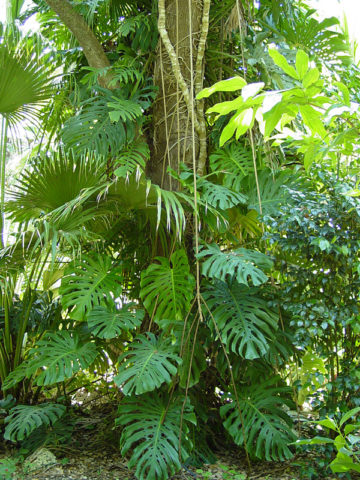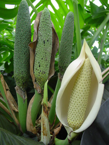 A highly tropical, fast growing vine that often times looks to be a shrub. The leathery green leaves are large with slits and holes frequently growing to 3 feet long by 3 feet wide. More amazing than the beautifully exotic leaf is the fruit that appears from the pollinated flowers. The fruit has hexagonal plates that protect the interior cream colored, juicy sweet pineapple-mango flavored pulp. Join the others at #monsteramonday.