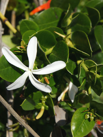 Intensely night fragrant, snowy white flowers bloom for months on the low shrub. Pollinated flowers turn into delicious orbs of wonderful vitamin packed goodness. Rich in vitamin C, calcium, magnesium and phosphorus these little guys are not just tasty but good for you. Pick and enjoy when fully ripe and bright red, but be cautious as the small diameter branches have sharp double thorns. How can you not grow them, they smell good, produce edible fruit and with the forked thorns on the stems, make a fantastic security hedge. Word of warning all parts of the plant are toxic EXCEPT the ripe fruit.