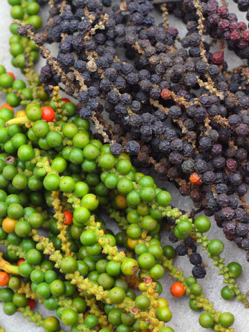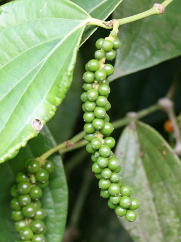 An aromatic flowering vine cultivated for its fruit known as a peppercorn. Peppercorns and the powder made from grinding them is broken down into black, cooked and dried unripe fruit, green, dried unripe fruit, and white, dried ripe seeds. Peppercorns are actually the fruit of the small white flower produced by the leathery leaved vine. These showy vines can grow up to 20 feet and the leaves and have a distinct citrus aroma when crushed. Piper is easy to grow in a moist well drained soil and requires little attention once it establishes. A single established stem will bear 20 to 30 fruiting spikes. The harvest begins as soon as one or two fruits at the base of the spikes begin to turn red, and before the fruit is fully mature, and still hard; if allowed to ripen completely, the fruit lose pungency.
