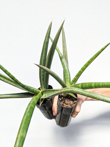 Before leaving, Sansevieria are inspected, watered, and pruned. Larger plants, generally those that ship in 8″ pots, will be topped to 36″ or 48″ overall, depending on the variety, if necessary, to facilitate shipping. Your new plants’ pot is then bagged to ensure that the soil stays in the pot and not loose in the box. Plants are tissue or kraft paper wrapped and generally secured in place with natural biodegradable peanuts.