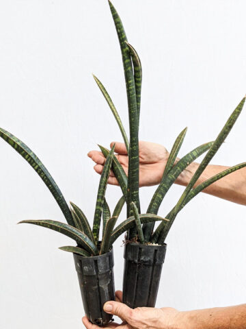 Deep green stems have a smoky gray banded pattern. Juvenile cupped leaves eventually give way to a larger cylindrical shape while holding the deep coloration and pattern. May reach two feet in height at full maturity. Spring and early summer delicate lightly scented flowers emerge from stalks. Commonly grown indoor for its ability to detoxify and purify the air. Sansevieria are easy to grow and simple to care for.