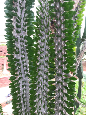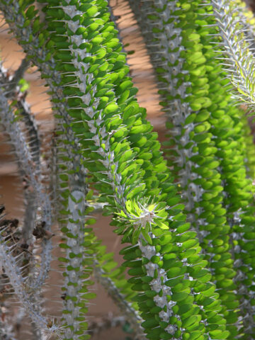 Before leaving, Alluaudia are inspected, watered, and pruned. Larger plants, generally those that ship in 8″ pots, will be topped to 36″ or 48″ overall, depending on the variety, if necessary, to facilitate shipping. Your new plants’ pot is then bagged to ensure that the soil stays in the pot and not loose in the box. Plants are tissue or kraft paper wrapped and generally secured in place with natural biodegradable peanuts.