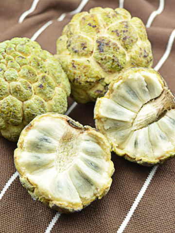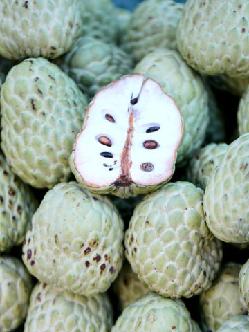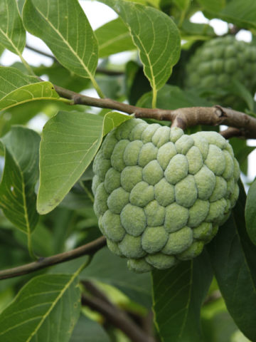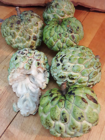 The Annona Squamosa is a shallow rooted tree that is highly accepting of varying soils and is drought tolerant. A nearly rounded fruit with a thick rind and a knobby reticulated exterior that separates when fully ripe to reveal a mass of glistening, creamy-white, sweet juicy segments, ripens around November and is typically baseball to softball size with a flavor reminiscent of sugary sweet custard. The pulp comes apart in segments each containing a small black seed that separates easily from the fruit. The trees begin to fruit at just one to two years of age, and they can easily be maintained at a height of eight to ten feet.