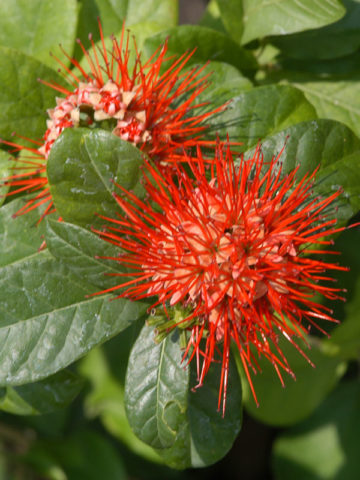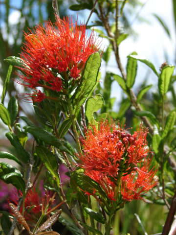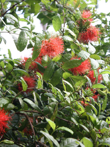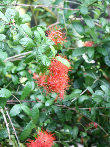 Delicate fluffy looking balls of scarlet red, short petaled, tubular, unscented flowers emerge in abundant, rounded clusters from the long branch ends on this smaller shrub. Small semi-glossy, rounded leaves in medium green, grow from the compact, woody stems. The tight compact nature of this small tree makes it great for growing a hedge with, if planted in multiples and pruned regularly. The Constrictum is best planted in groups to make a dramatic effect in the landscape.