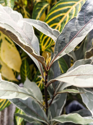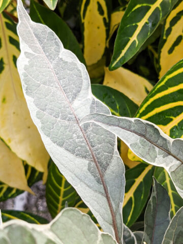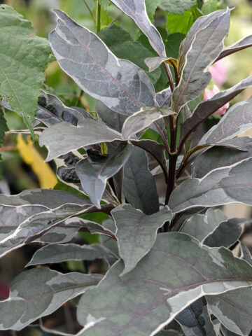METALLIC HUED – Deep muted hues of cream, white and green. For use as a potted plant or grown in -ground, it will happily remain around 3 feet tall. Warm weather brings small lavender-purple flowers that contrast nicely with the colorful leaves.