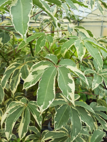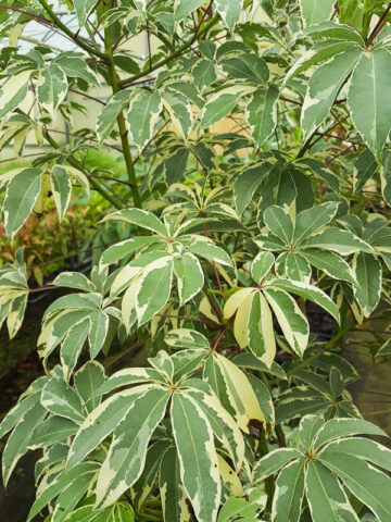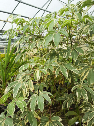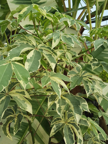 This highly variegated tree is capable of reaching massive heights over 50 feet at maturity. Known to be a super fast-growing tree, it can put on 40 inches or more in a growing season for the first 10 years, then slows down considerably to build more girth and bulk in subsequent years. The fresh white wood is extremely tender but slowly hardens with the trunk turning a silvery grey. Medium sized palmed leaves are 6 – 7 inches and glossy green with white or yellow variegation. Flowers are heavily scented, nocturnal bloomers with nectar, looking for pollination by bats, moths and bees and bloom in winter when the tree has lost its foliage. Due to the large above ground roots this awesome tree will require some well deserved space in your tropical garden.