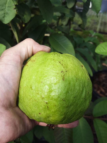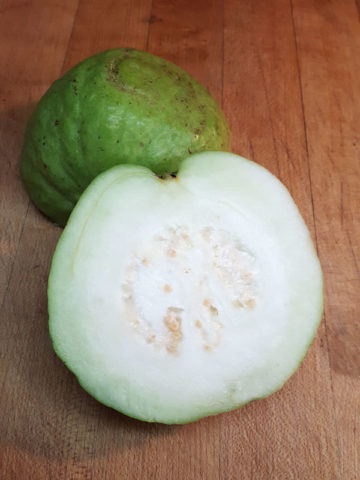 Vietnamese (oi song) Guava is a high yield tree from Vietnam, producing medium size fruit for eating fresh off the tree or canning and preserving. The bumpy, round shaped fruit is pale green on the exterior with a unique creamy white interior flesh. Fruit typically scales in at 0.8 – 1.3 lbs. and are floral, mild and aromatic with a sweet juicy pulp. The maturing trunk of this Guava tree is covered in beautiful copper colored bark that peels off regularly to expose shades of pink and green. Light pruning is recommended to develop a strong base in order to support the additional weight during fruiting season.