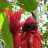 Golden Star is an unusual variety for the avid collector. Unlike other varieties of Etlingera, this ginger is a prolific ground bloomer, producing an abundance of gold laced burnt orange blooms. This massive gingers stems can grow to great heights of 18 – 20 feet and sport 3 foot long leathery leaves. In zone ten this Etlingera will continue to spread indefinitely until reaching a solid path or being trimmed.