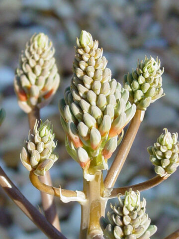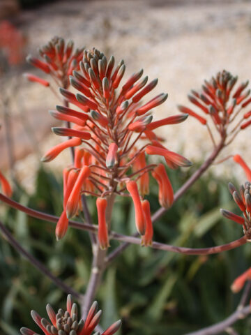 Soap Aloe- The fastest growing of all the aloe this plant freely suckers and is usually stem less. It has been known to grow into a mound of 18 inch wide rosettes with dark green broadly lance-shaped leaves marked with yellowish white spots or blotches. During the late spring to early summer orange-red flowers are produced on stalks that raise the flowers 2- 3 feet above the leaves for bees and hummingbirds to visit.