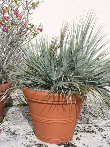(XL Specimen, 8” Pot) Blue Saw Palmetto make an attractively flowing potted plant, although it will eventually meander out of the pot. This is a smaller and hardy palm with clustering trunks that are subterranean until the plants reach age, at which time they usually emerge above ground and can grow to quite some length. Trunks are covered in dark brown fibers and silvery blue to blue green leaves with upright fanning fronds.