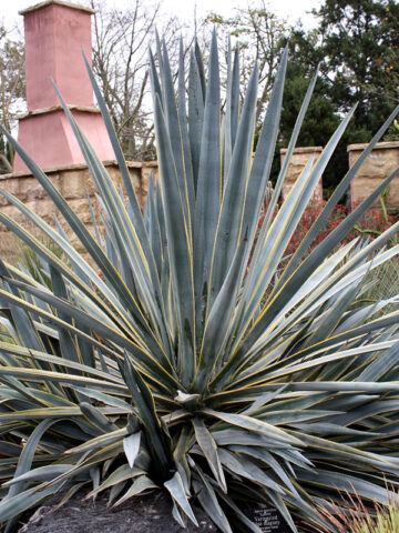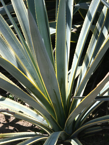 (XL Specimen, 6” Pot) An easy to grow, nicely variegated tequila variety. Agave tequilana Weber azul, is the only variety of agave permitted by federal law in Mexico to be used for tequila production. Used throughout Latin America in the making of tequila this handsome plant can grow to 15 feet in diameter and as tall as 30 feet when provided with the proper outdoor environment but can also maintain itself in a smaller container indoors or on a patio as well. The leaves which are a bluish green are thick and fleshy with spiny margins. A strikingly uniform and erect agave with a terminal spine that is large and amazingly sharp, it is a rapid grower and prolific off-setter. Tequila is produced by removing the heart of the plant once mature, removing the leaves, heating to convert the starches to sugars then the roasted core is pressed to release the sugary clear liquid, which is then fermented and distilled into alcohol.